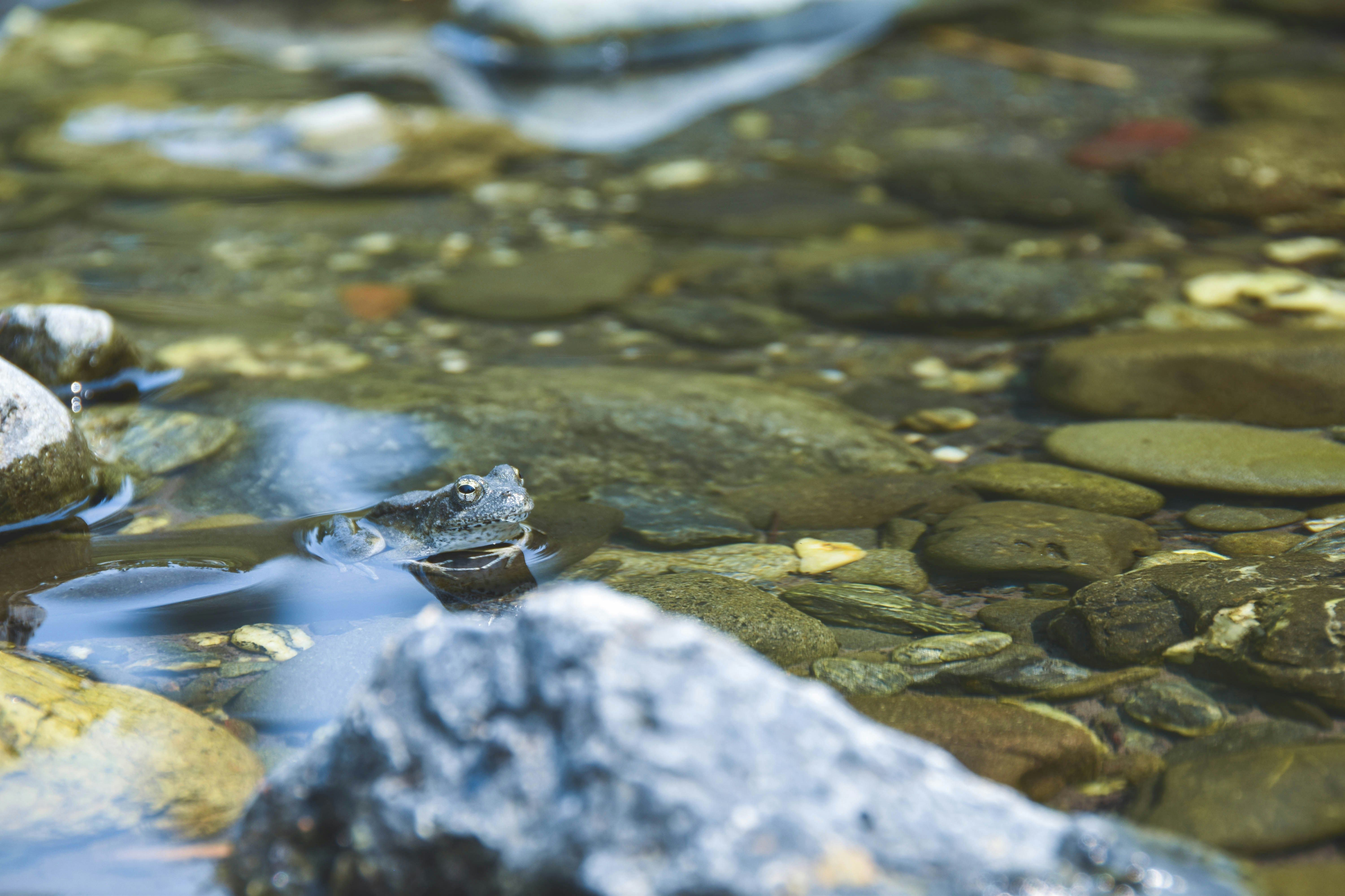 This is a river at the end of the Trail of Giants in the Redwoods National Park. Frogs are everywhere in this river; no matter where you look, you see a froggo.