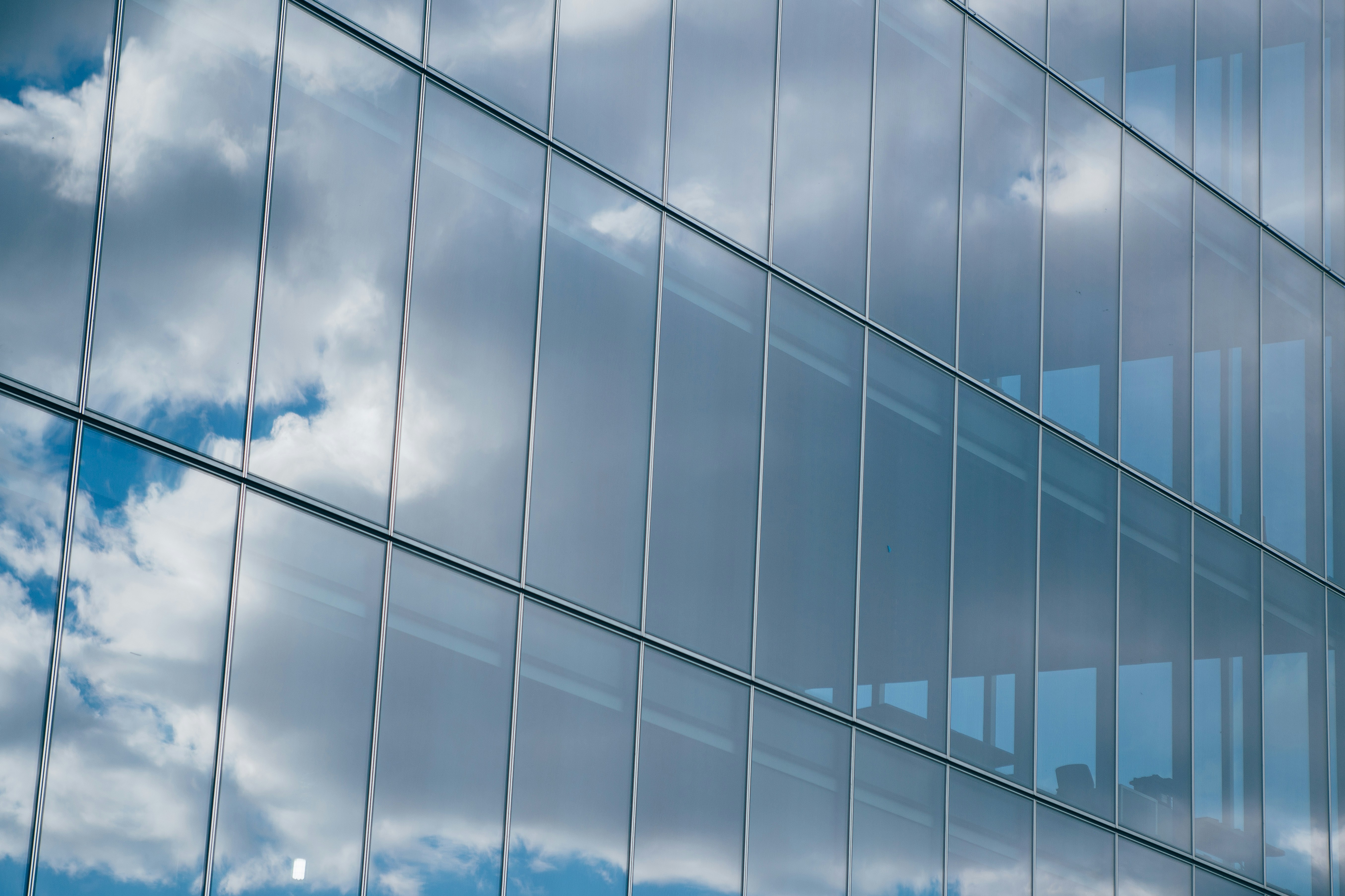 This shot was taken on the High Line, NYC. Next to the tracks there was a office building made of glass. On the glass facade you could see reflection of the lively weather, blue sky and clouds.