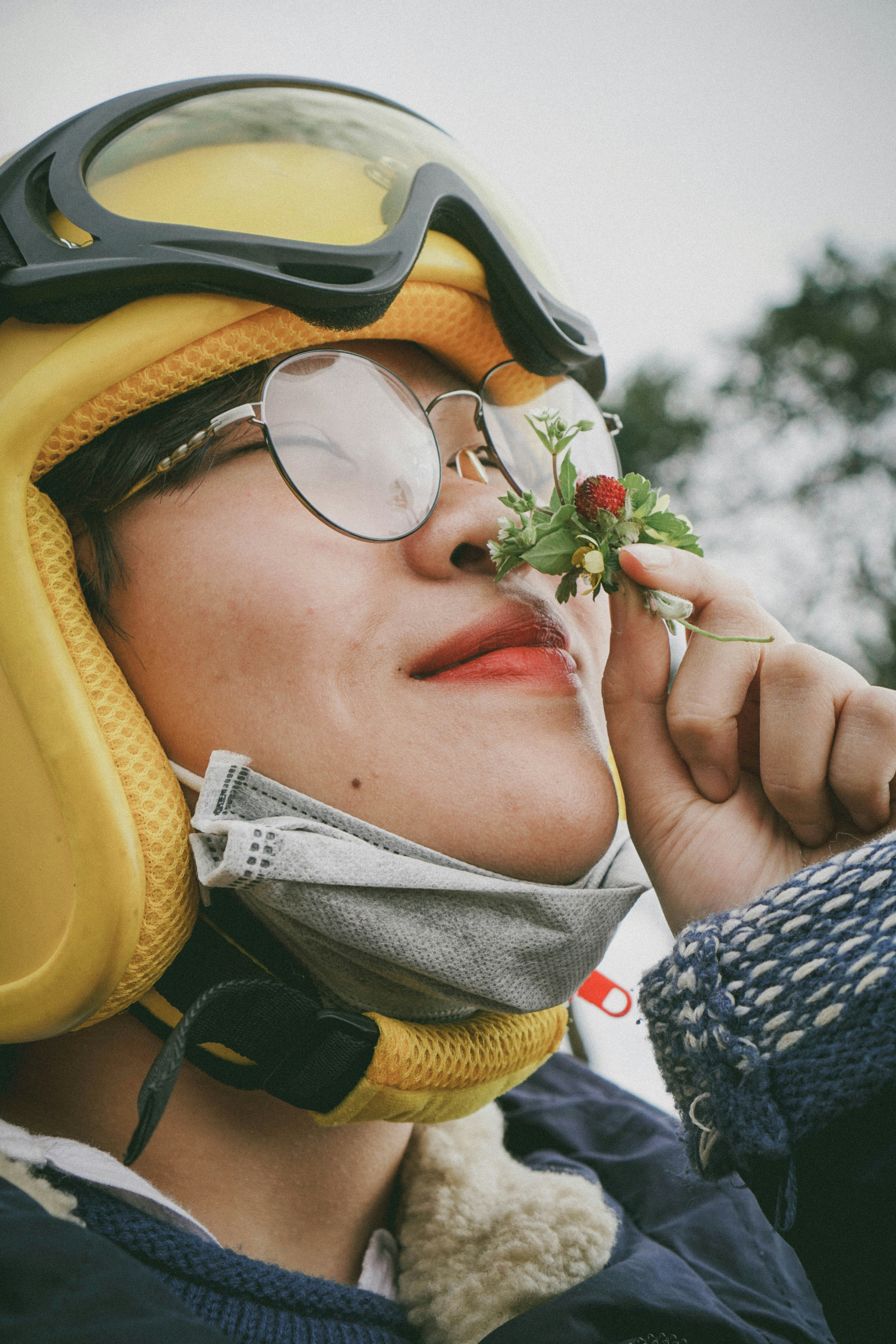 funny flat lay cat snout face on pink background with violet square glasses and pin smiling eyes by Natali Koromoto