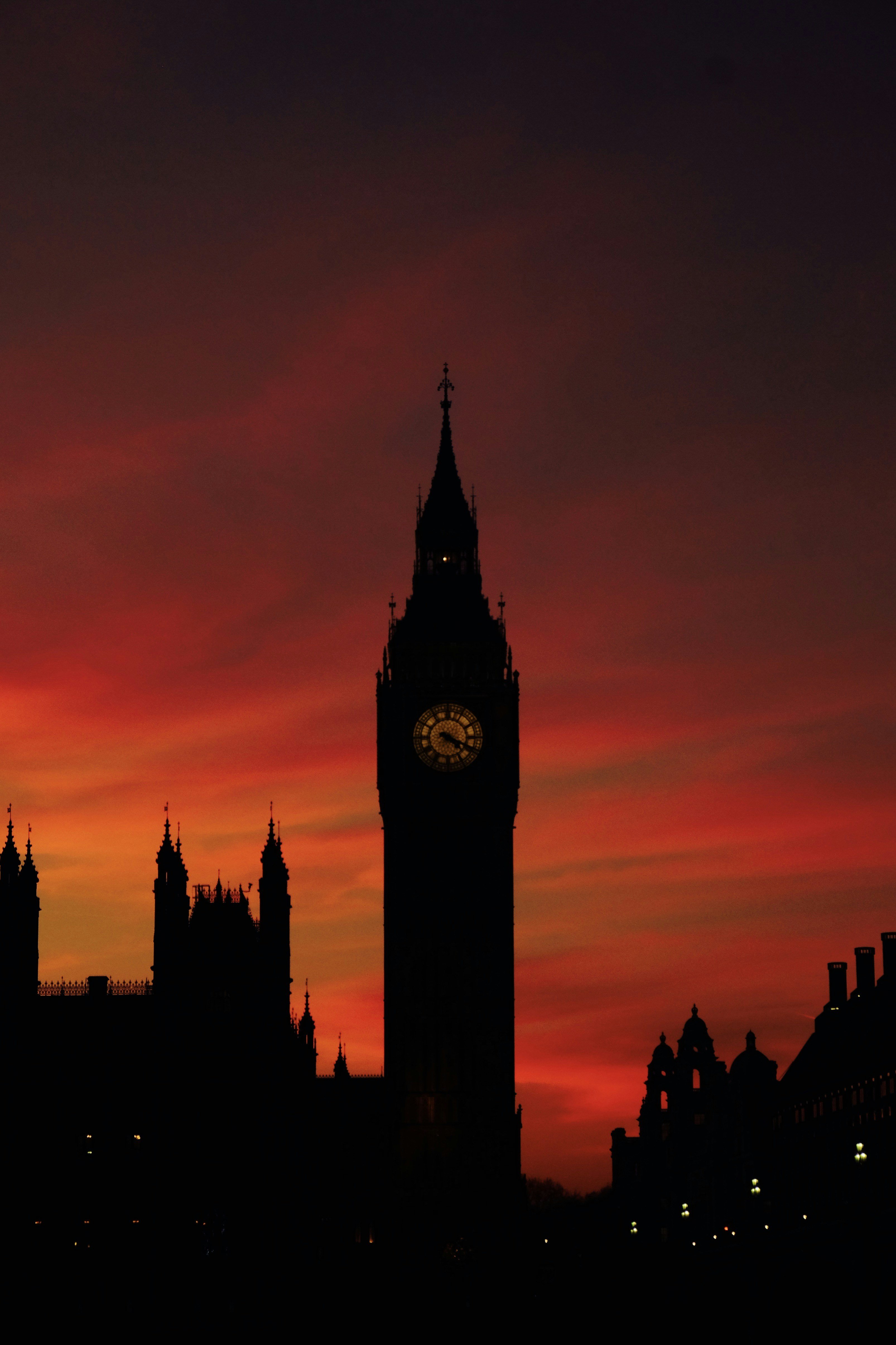 This image of Big Ben was taken on a clear evening as the sun was setting over London creating a beautiful red glow.