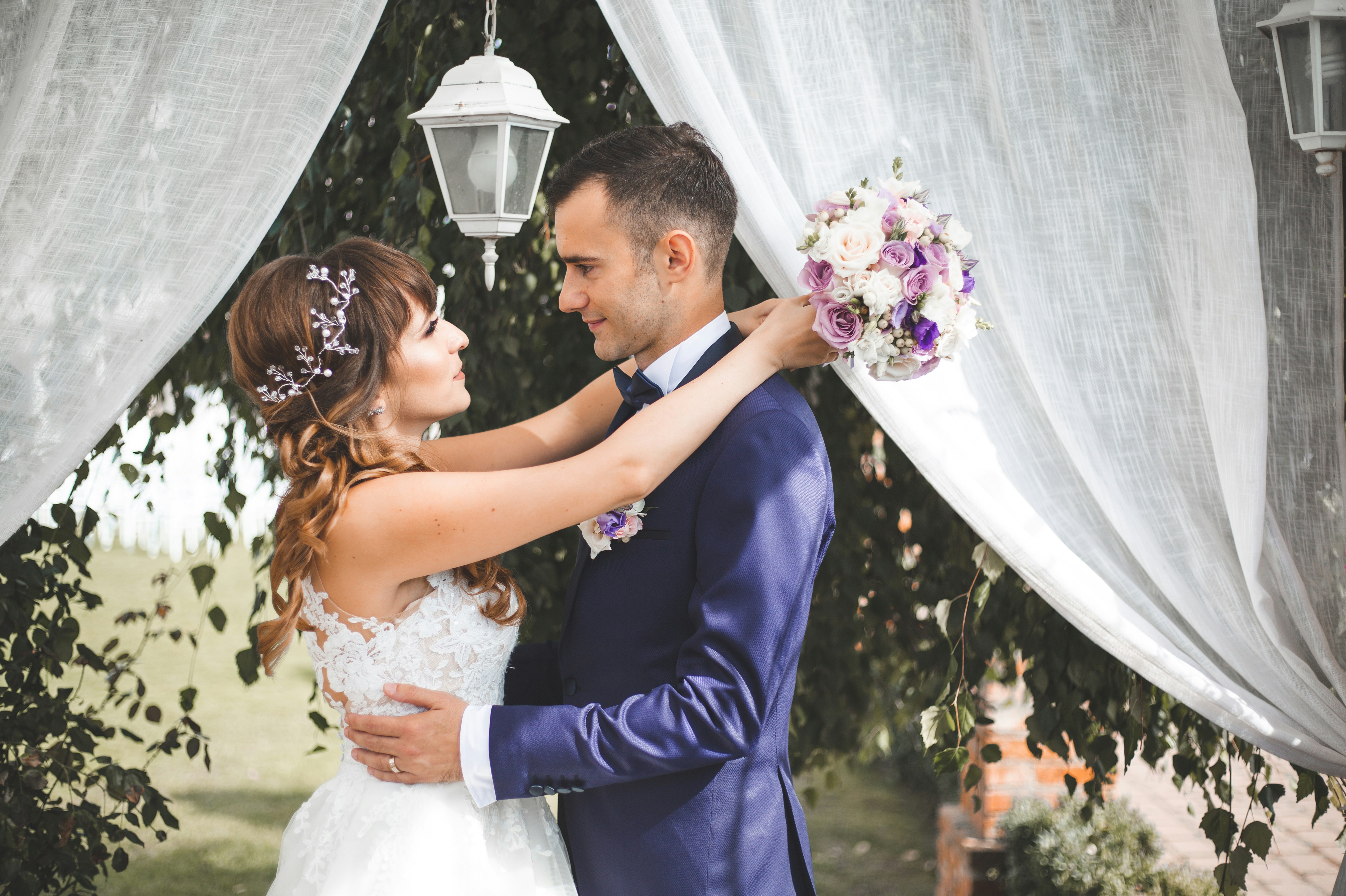 Groom and bride holding and looking at each other.