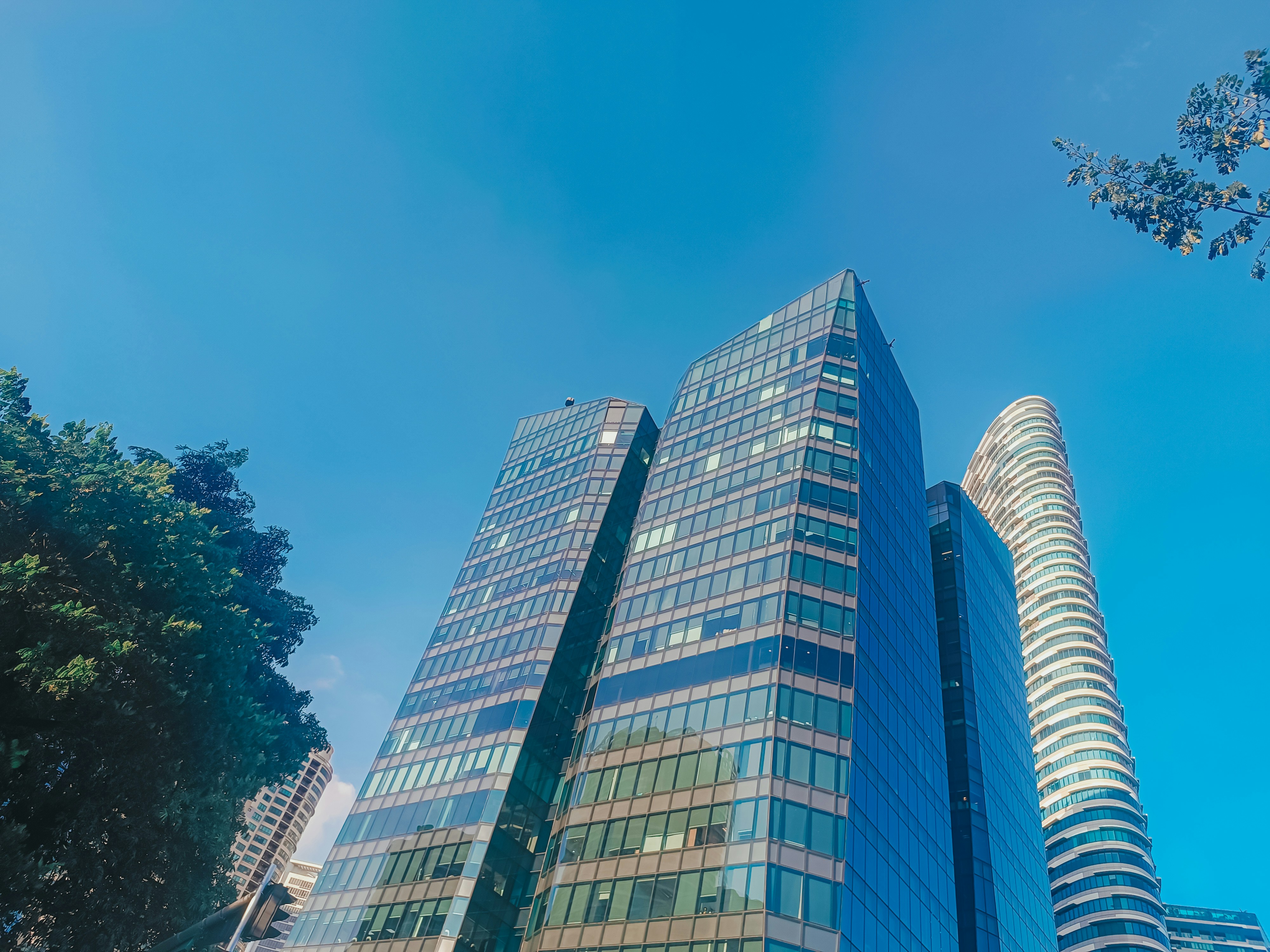 Green tinted office building against a blue sky