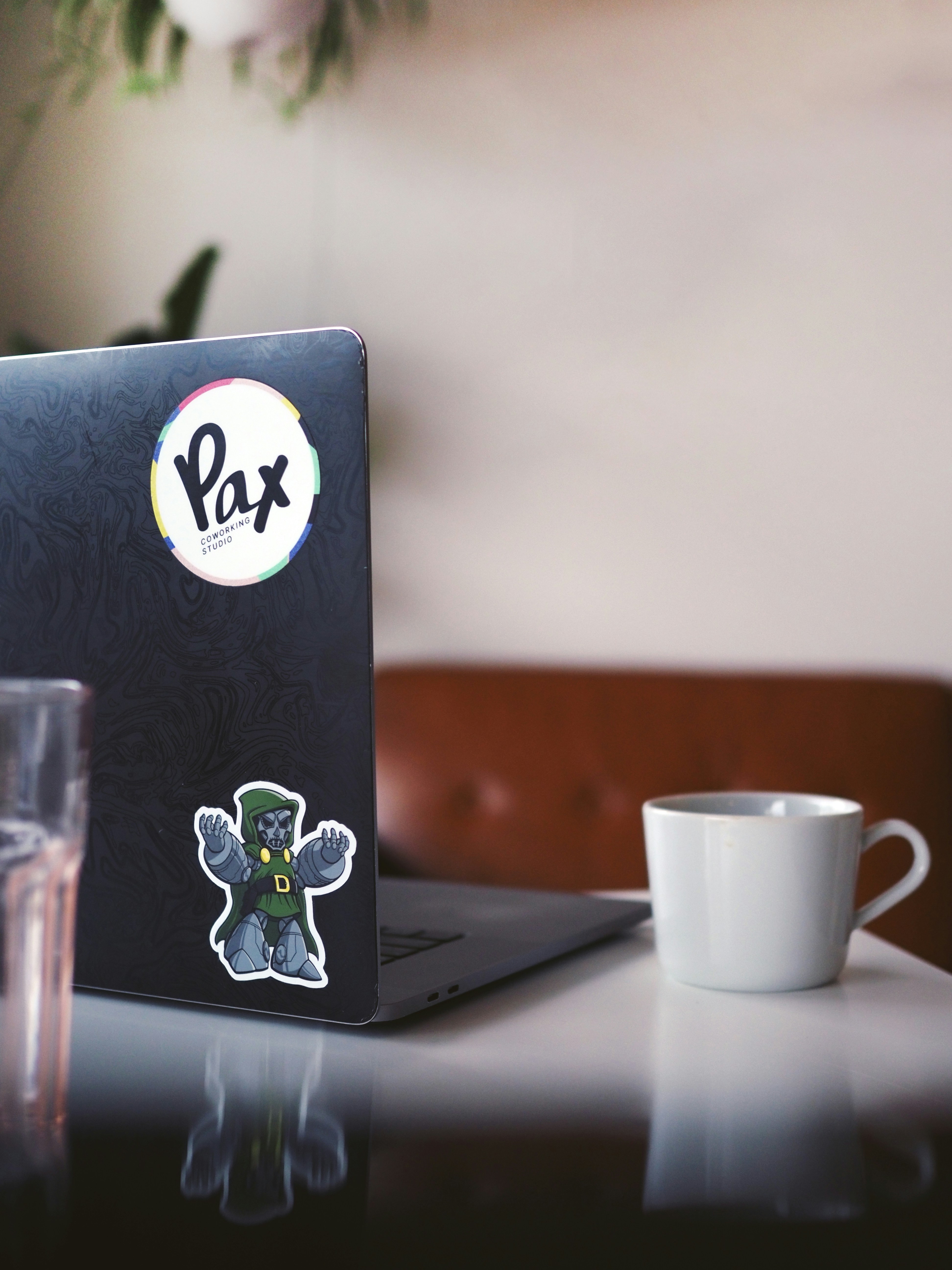 Doctor Doom welcomes you to another Monday at a local coworking studio with coffee, water, and a laptop resting on a white table.