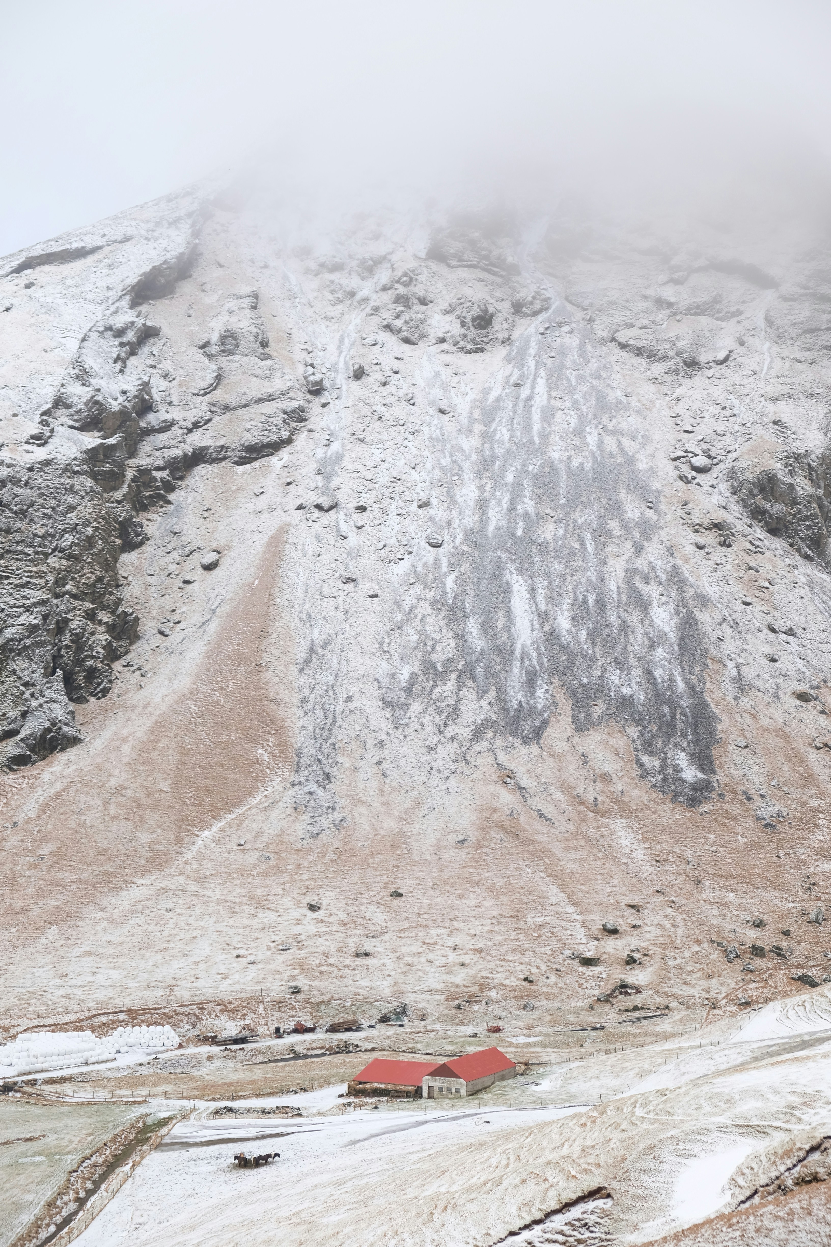 An Icelandic farm house and a field with horses sits below a towering snow capped mountain in southern Iceland. This photo was taken from the viewing point above the breath-taking Skógafoss waterfall.