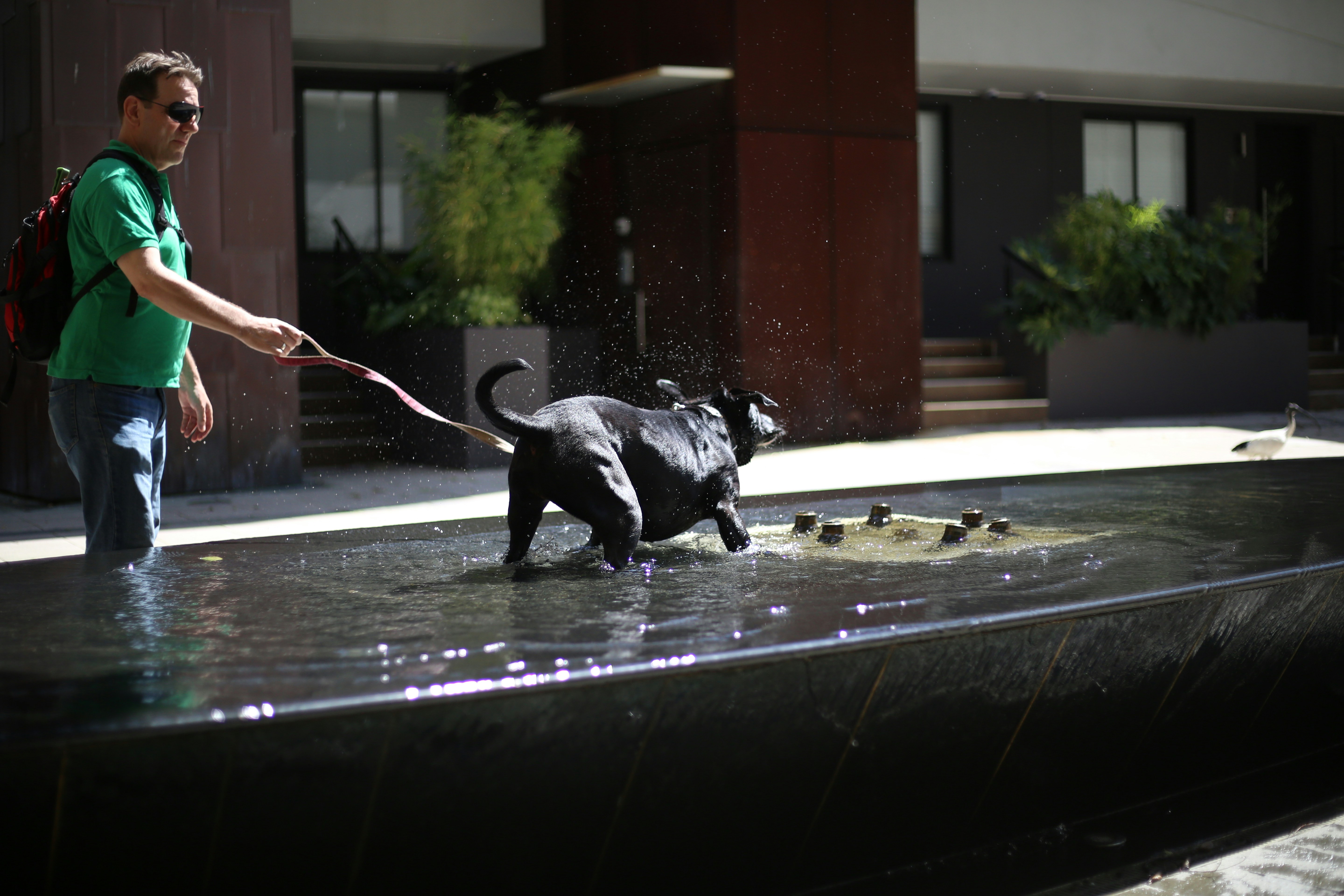 Dog cooling off in a fountain