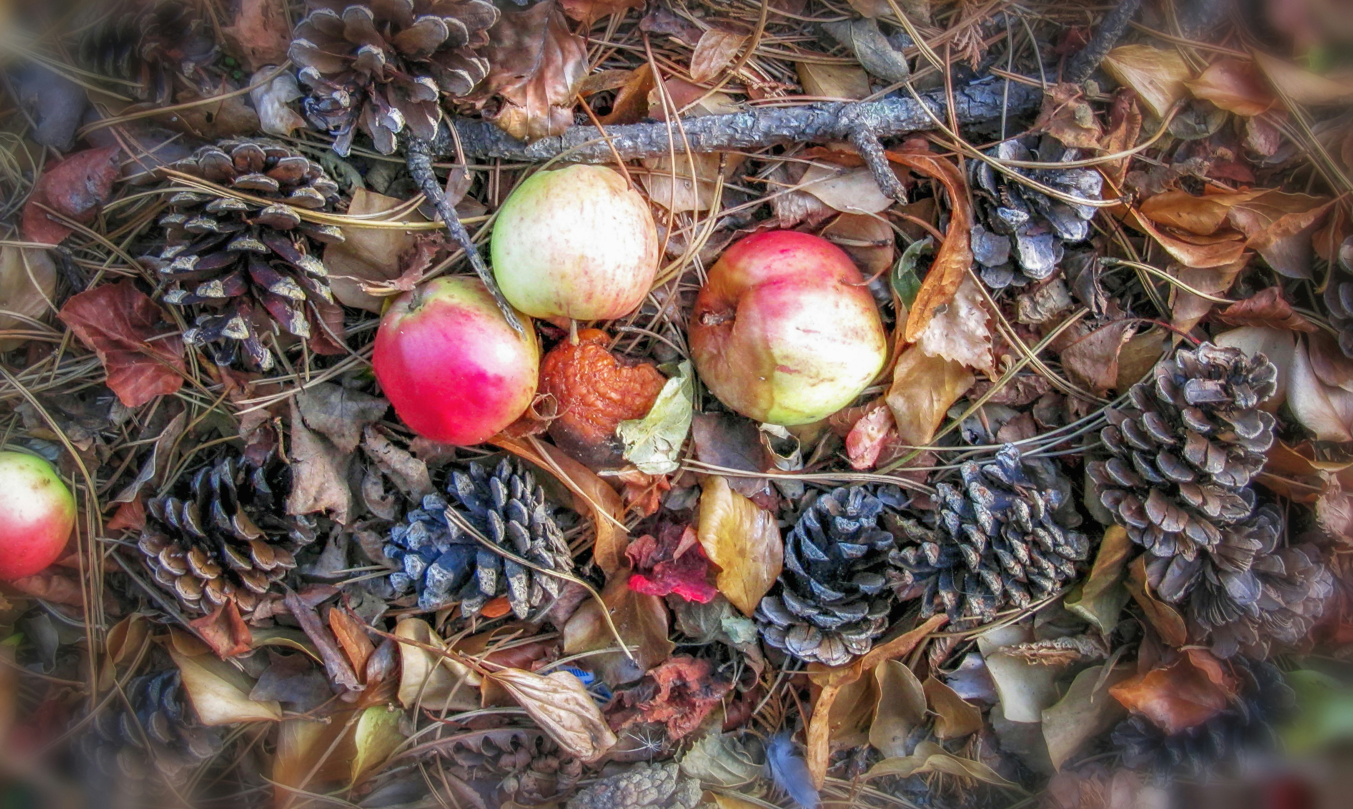 This combination of fallen fruit and pine cones caught my eye at the side of the road. The combination is natural but looks like a picture.