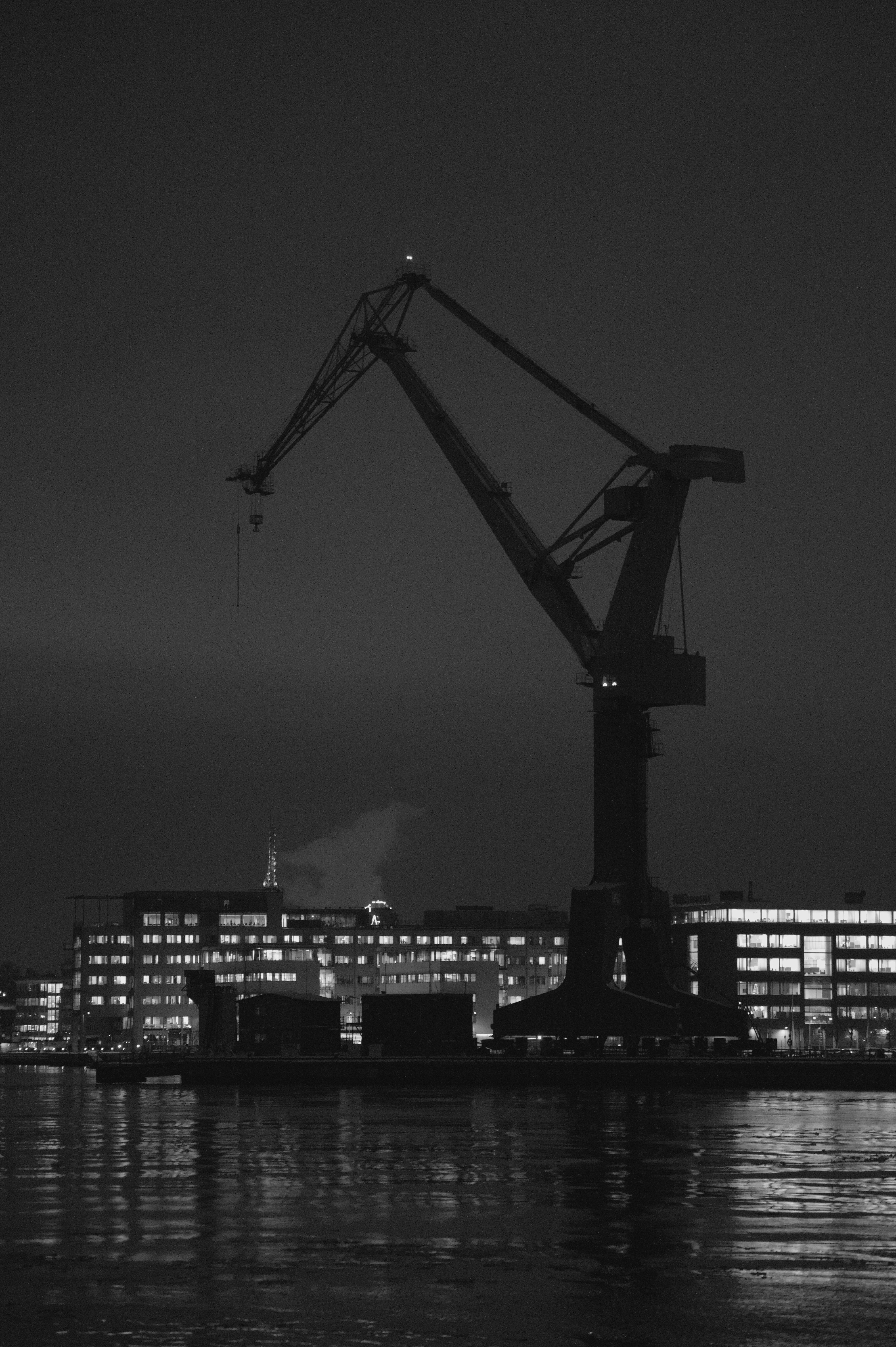 A black and white shot of a crane by the water.