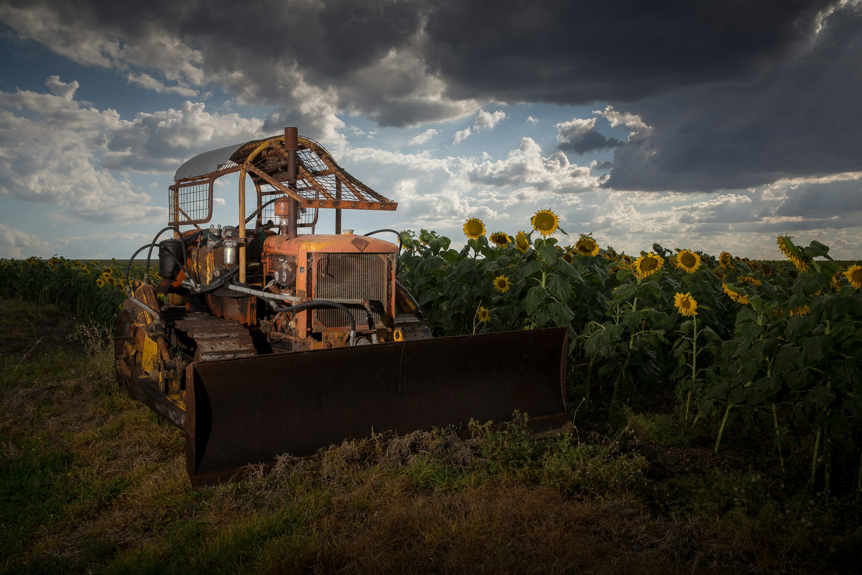 While driving in rural Queensland looking for aesthetically pleasing sunflower crops to photograph, I stumbled across this tractor by a sunflower field. I lit the tractor using a studio light to balance the scene.