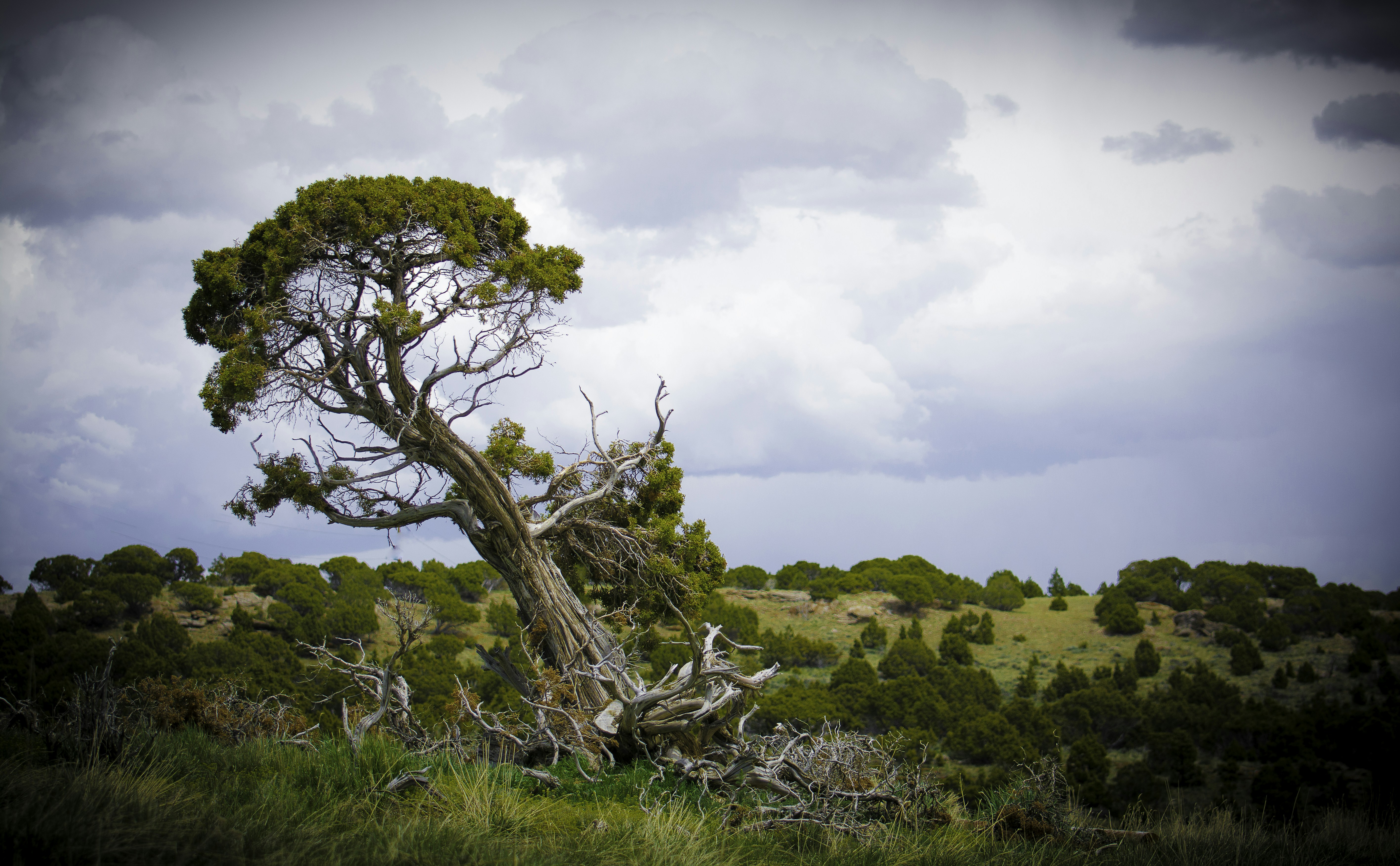 We often travel from Salt Lake City, UT to Rock Springs, Wyoming. I take my DSLR with me but rarely find much to shoot. This trip was different. It rained–a lot–something unusual for this part of the world. Everything became more vibrant, more green, more real. This is a photo of a twisted juniper tree (likely twisted this way due to the constant wind in this area). Not far from here are wind farms. My husband was very patient as I kept scouting the area for the best way to take the photo. It make the trip worth it.