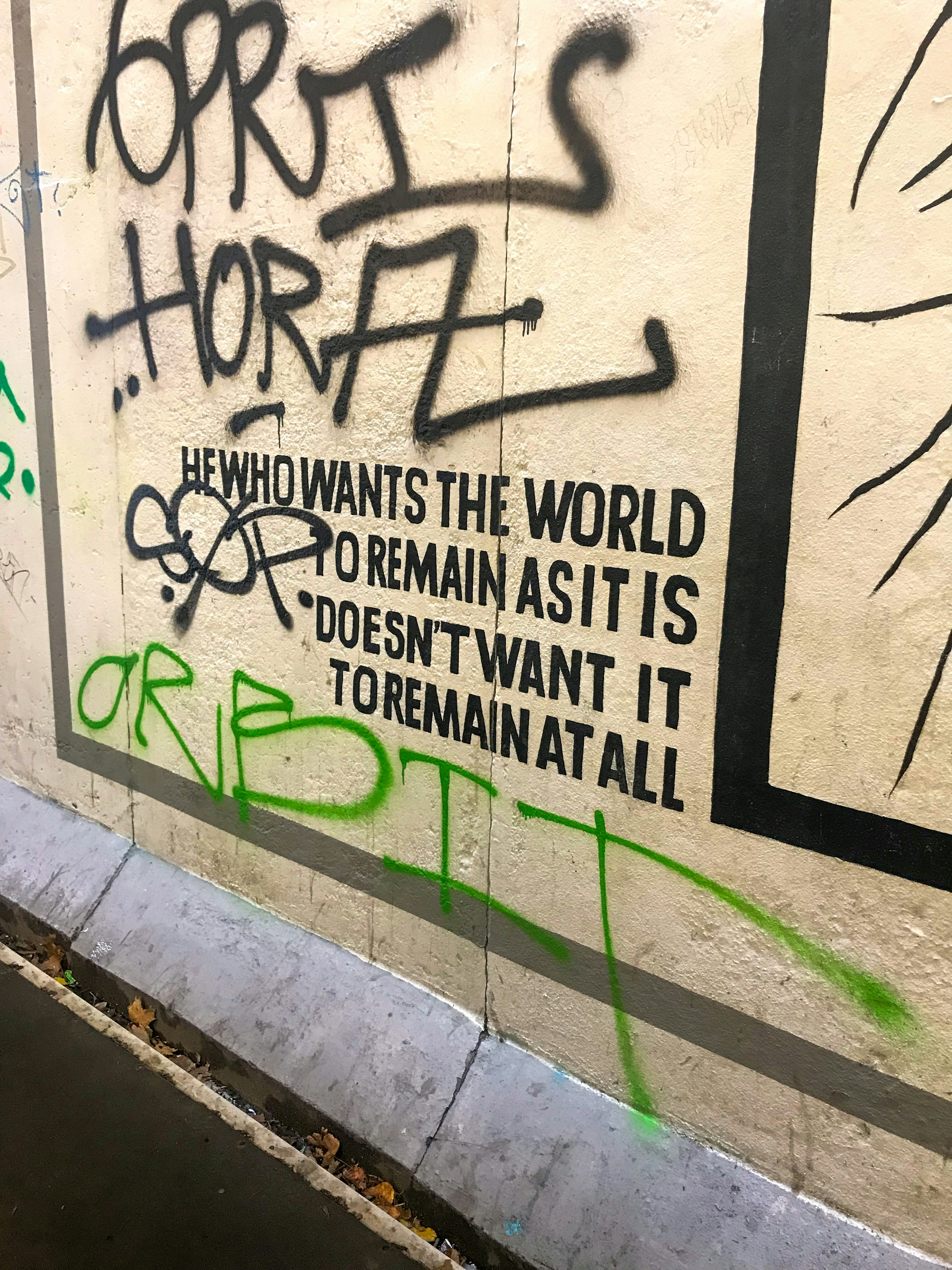 Graffiti quote on the Berlin Wall memorial in Berlin, Germany. He who wants the world to remain as it is doesn’t want it to remain at all.
