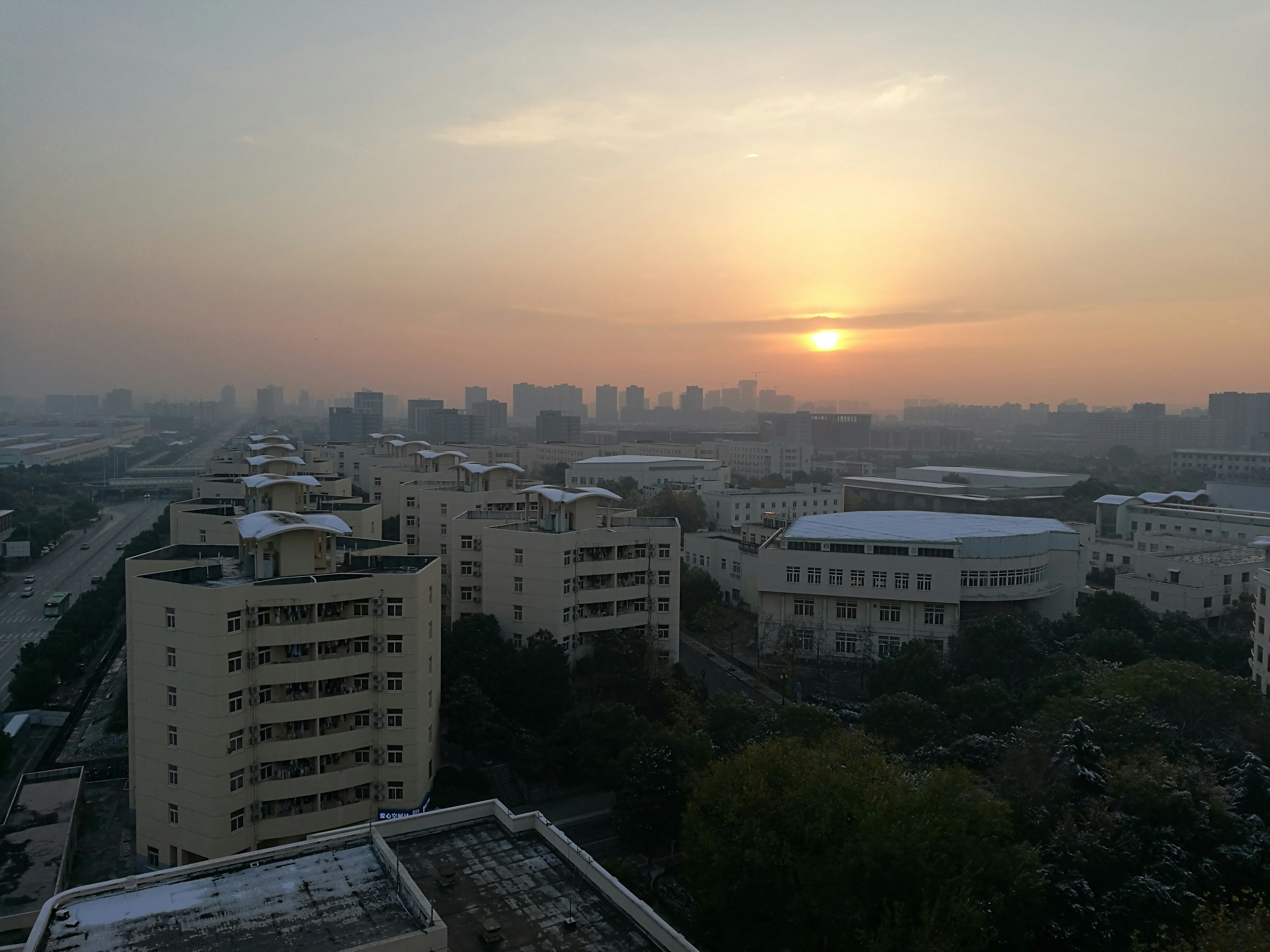 Recently it snows first after the fall in Nanjing. Because of the snow, the roof top of the dormitry in NUAA came into white. The Foggy morning held the sunshine in the city.