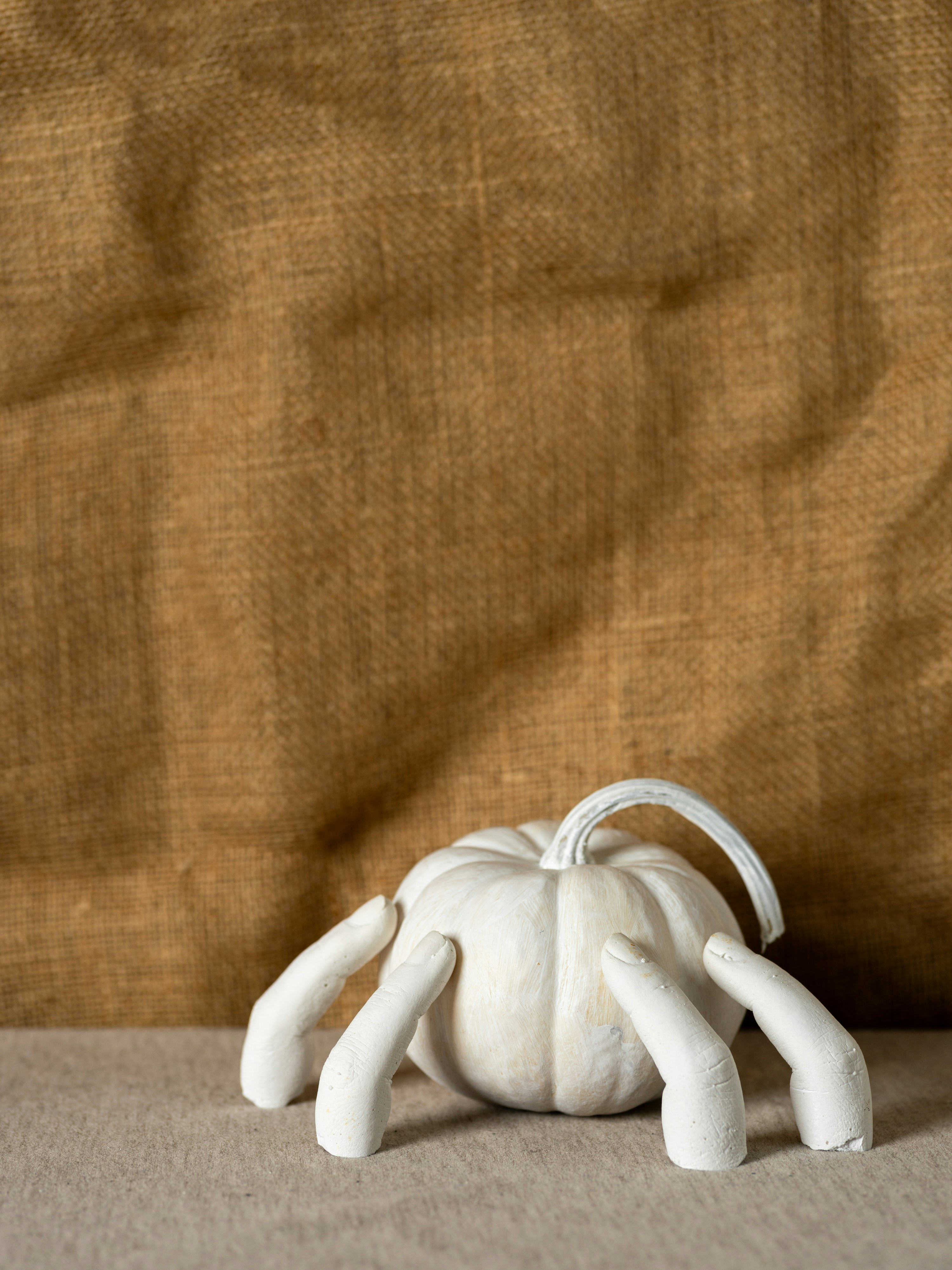 Still life of white pumpkins and ceramic fingers on a burlap background.