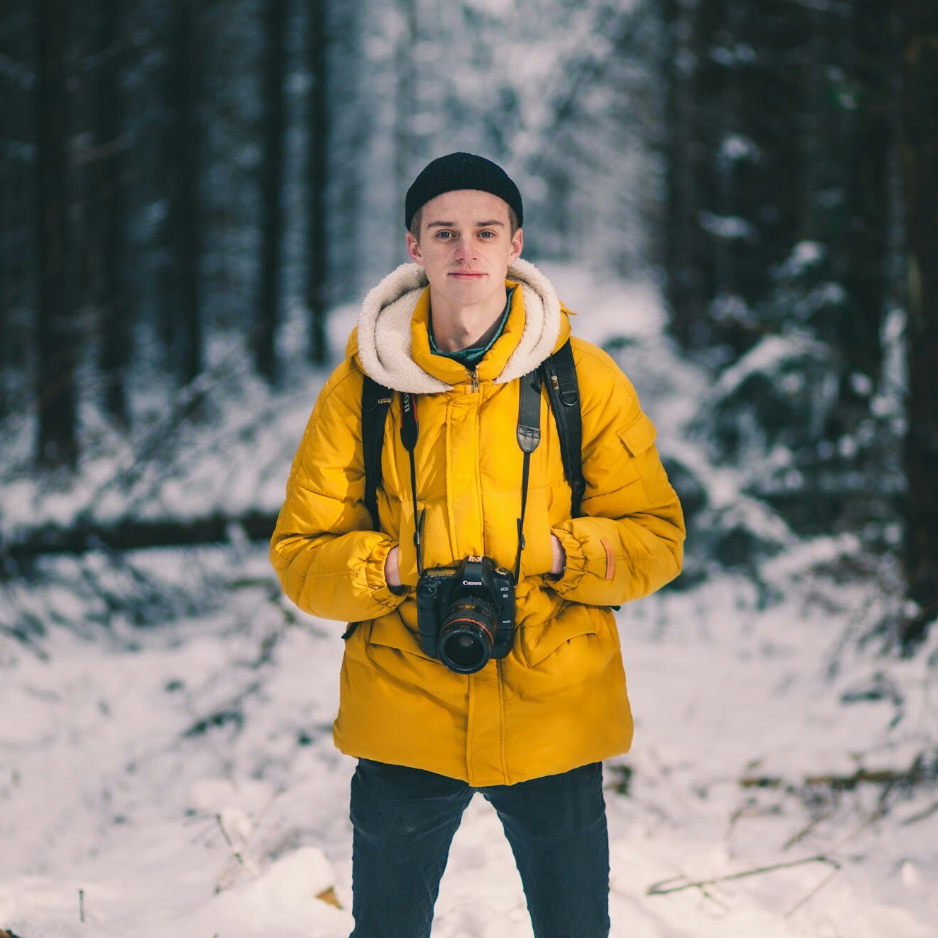 A group of smiling young people sitting around a fire pit in the mountains